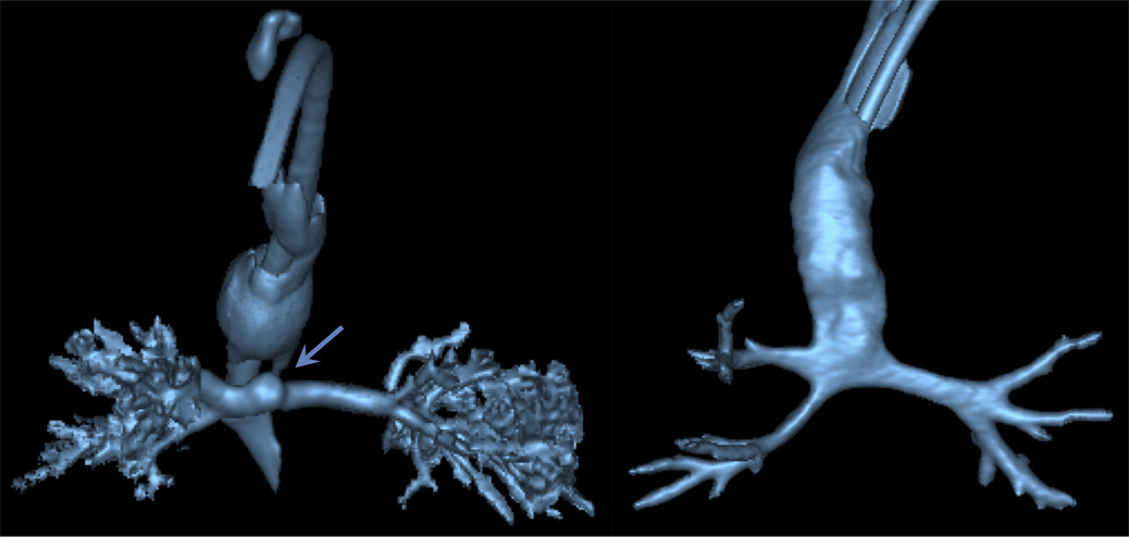 The patient was then transferred to Children’s, where a CT angiogram confirmed long-segment tracheal agenesis with an esophageal fistula at the level of the carina, and distal bronchomalacia. A chest x-ray evaluation showed rib fusion anomalies, and an echocardiogram revealed a large patent ductus arteriosus (PDA).
