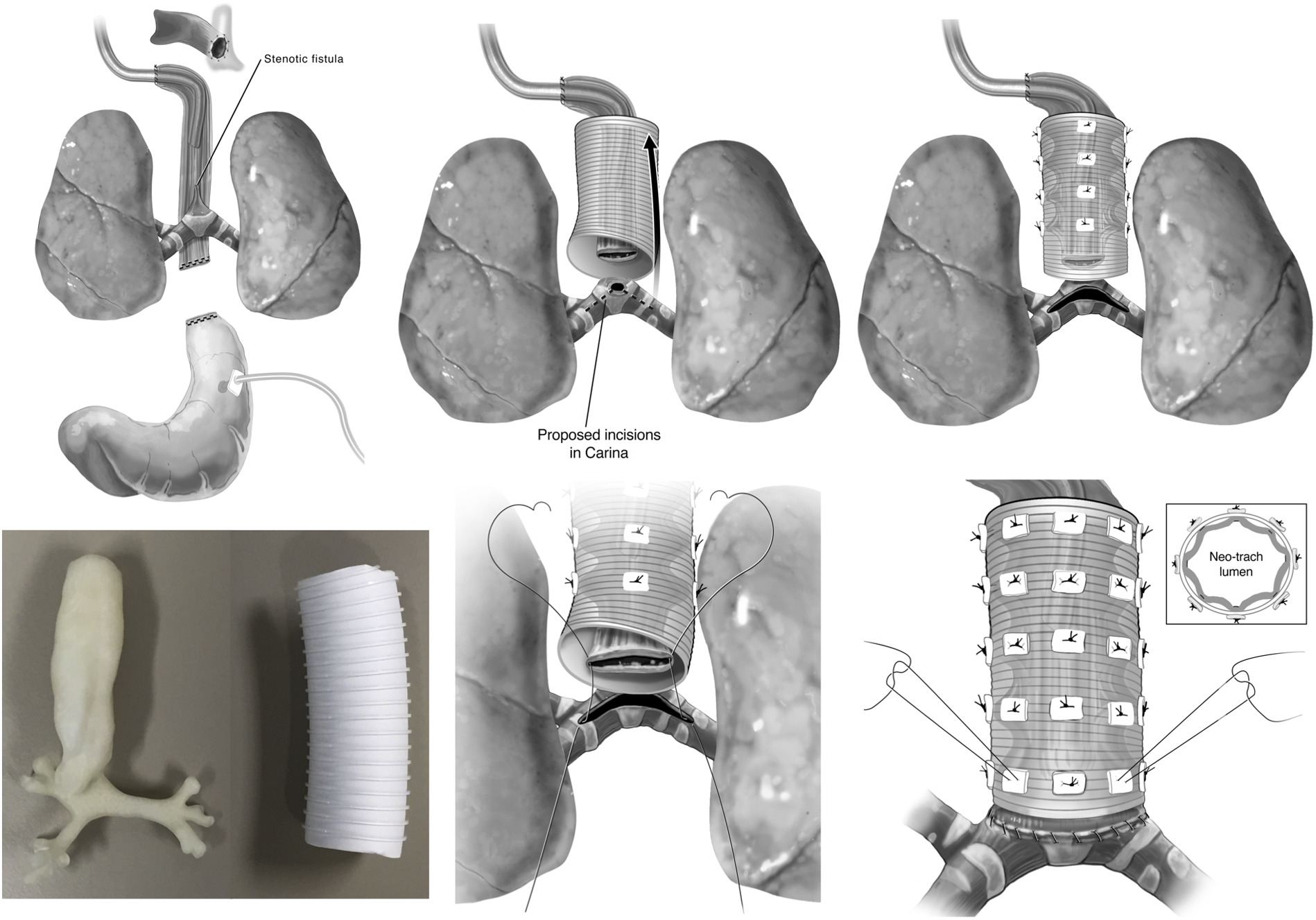 Over the next three months, the patient underwent additional surgeries to construct an esophagus. This included the creation of a “pseudo” tracheostomy, which was replaced a few weeks later with a custom 4.0 cuffed Bivona tracheal tube. At 3 months, surgeons performed an esophagocarinal fistula resection and external stenting of the “pseudo” trachea while the patient was on cardiopulmonary bypass. He was discharged home at 4 months, becoming the first patient with tracheal agenesis in the United States to survive to hospital discharge.